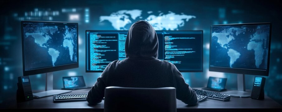 Hooded hacker working on computer. Dark operating room with multiple monitors. Cybercrime, attack and cyberattack concept. Cybersecurity, data protection. Global network.