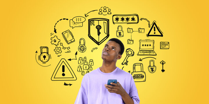 African man with phone and cybersecurity sketch