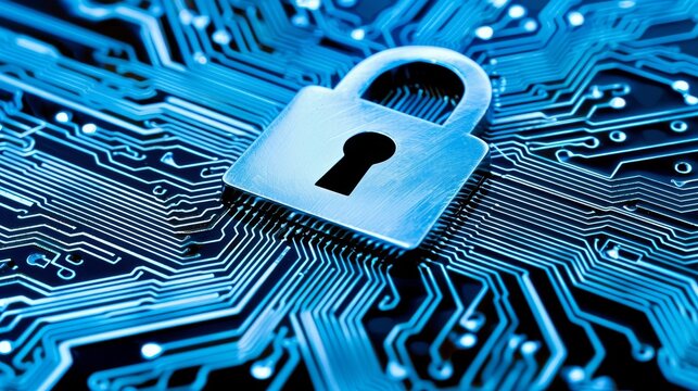 Glowing lock symbol with cybersecurity circuit background