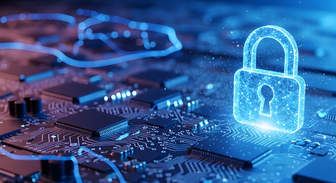 Cybersecurity concept with glowing digital lock icon over circuit board background