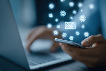 Close-up of hands typing on a laptop with digital shield and lock icon overlay, representing cybersecurity, password protection, online privacy, and data security in the digital world.