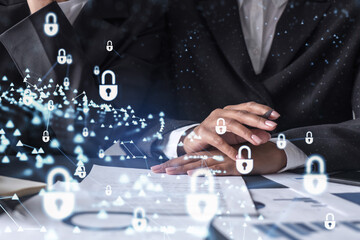 Two businesswomen working on the project to protect cyber security of international company. Padlock Hologram icons over the table with documents.