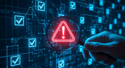 Cybersecurity Alert: A hand holding a magnifying glass highlights a glowing alert icon at the center of a digital grid representing an urgent cybersecurity threat.