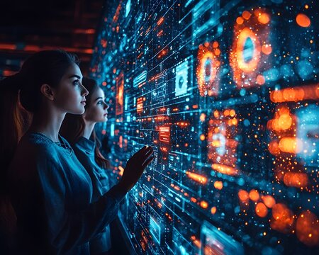 Data analysts collaborating on a virtual dashboard to detect financial fraud