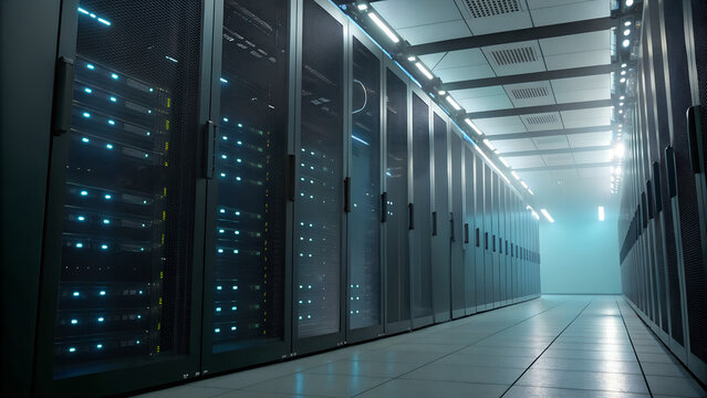Modern data center interior with illuminated server racks and blue lights creating high tech atmosphere ideal for IT infrastructure, cybersecurity and cloud computing visuals