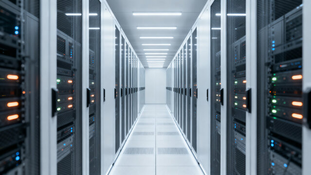 Modern Data Center Corridor with Symmetrical Design, High Tech Infrastructure