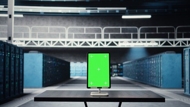 Green screen tablet in data center left running by engineers for software updates. Mockup device in server hub optimizing infrastructure supercomputers configuration for high performance