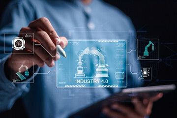 Smart industry 4.0 concept, Person use tablet with virtual screen of physical system, smart industrial revolution, automation, robot assistants, iot, cloud and big data.