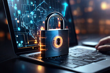 Enhance cybersecurity with a digital padlock icon on a virtual interface screen. Safeguard your online presence and protect business data privacy against cyber threats.