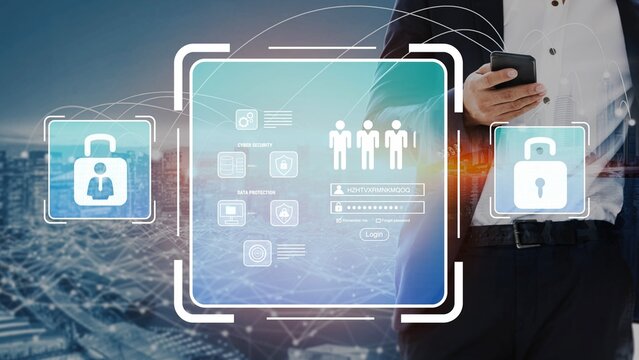 Futuristic Person Using Smartphone with Security Icons and Digital Interface Over Cityscape for Technology and Communication Concepts Gluon.