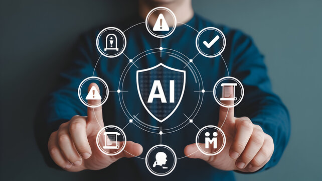 AI technology concept with shield icon surrounding digital icons representing artificial intelligence and cybersecurity