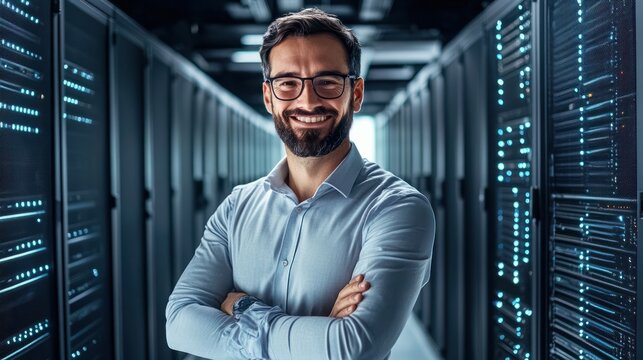 Shot of a Smiling IT Engineer Standing in the Middle of a Working Data Center Server Room. Visualizations of Data Transmission Through High Speed Internet. User Interface Icons in the Foreground.