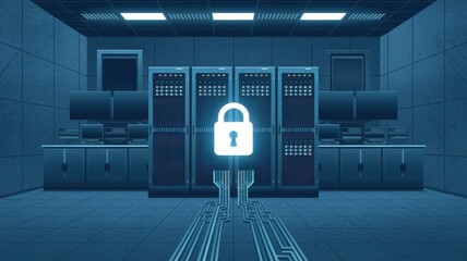 Digitally secure server room with lock icon overlay
