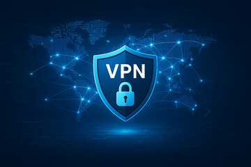 VPN secure connection graphic with glowing shield and lock icon over world map, representing global cybersecurity, encrypted internet access, and digital privacy protection, VPN secure connection,