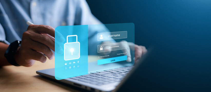 Businessman typing on laptop with virtual login interface overlay showing username, password, and security lock. Concept of data protection, identity verification, and cybersecurity.