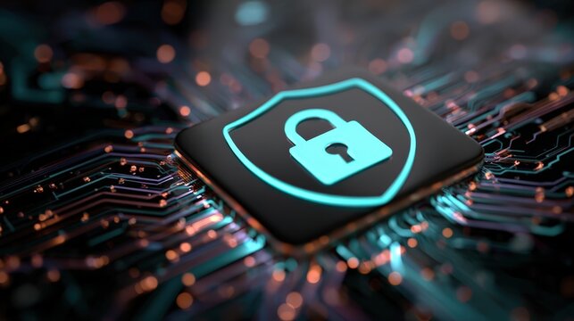 Secure Digital Lock Symbol on a Background of Circuit Board Patterns and Lights