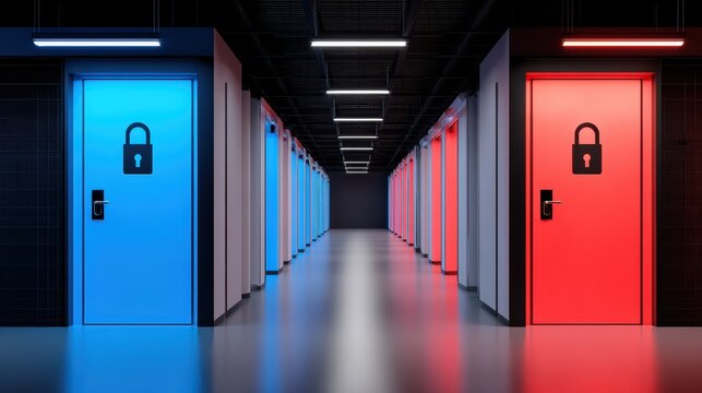 Modern data center server room with secure lock doors illuminated in blue and red lighting in a high-tech environment