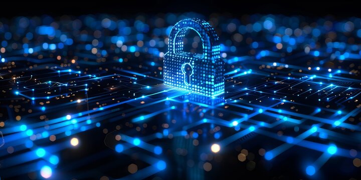Digital padlock on a glowing blue circuit board representing cybersecurity and data protection