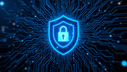 Digital Security Shield with Lock Icon in Futuristic Technology Style
