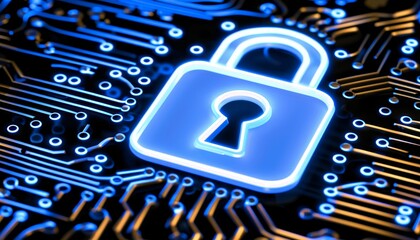 Glowing padlock icon on virtual circuit board for cybersecurity
