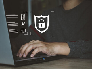Technology cybersecurity and privacy concept. Protection and safe data for global network security. Businessman holding shield padlock protect icon.