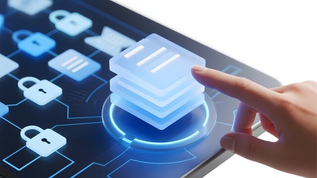 Hand interacting with digital interface displaying security icons and layered data blocks