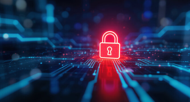 Futuristic electronic circuit with neon padlock and placeholder text showcasing cybersecurity, personal data privacy, and advanced internet networking protection systems