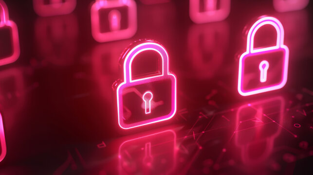 Glowing pink padlocks symbolizing cybersecurity and data protection in a digital environment. Illuminating safety and encryption.