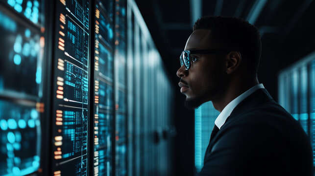 A Black African American male IT professional working in a high-tech server room, engaged in analyzing data breaches. The illuminated screens display alerts about privacy threats,