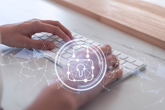 A woman programmer is typing a code on computer to protect a cyber security from hacker attacks and save clients confidential data. Padlock Hologram icons over the typing hands. Casual wear.