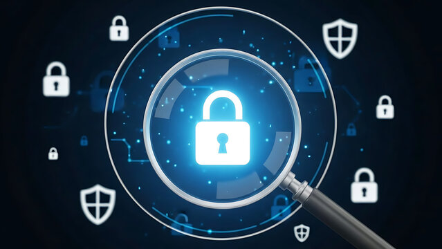 Cybersecurity concept with glowing padlock and digital shields representing data protection and network security