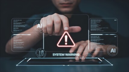 System warning alert on virtual interface with hand interaction. Concept of cybersecurity risk, data breach, malware, hacking, IT failure, and digital system vulnerability in modern technology.