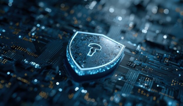 Digital shield graphic over a complex circuit board.