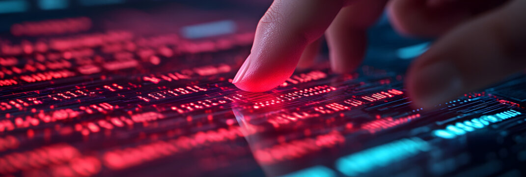 A close-up of a finger hovering over glowing, digital code, showcasing technology and data interaction in a vibrant interface.