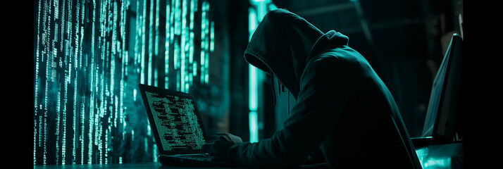 Silhouette of hacker hunched over multiple computer screens in a dimly lit room. The screens display a green matrix of code and data