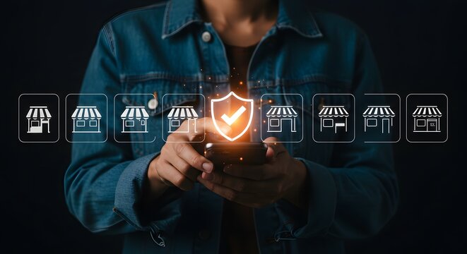 Small Business Security and Protection Concept: Shield with Checkmark Over Shops