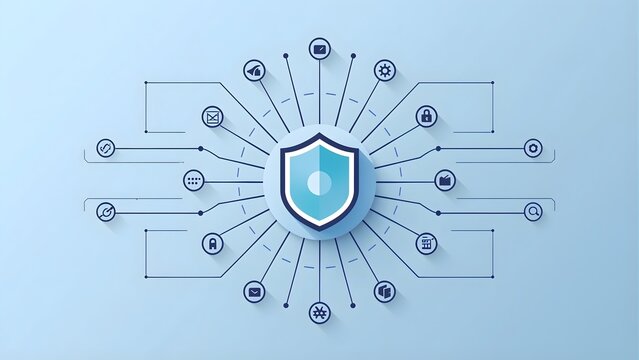 A cybersecurity shield icon with a blue and white design, surrounded by connected lines and symbols on a light blue background, representing online protection and security.