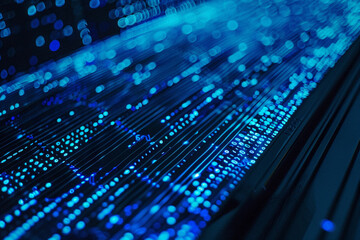 Digital Future: Blue Binary Data Flowing on a Computer Screen Background