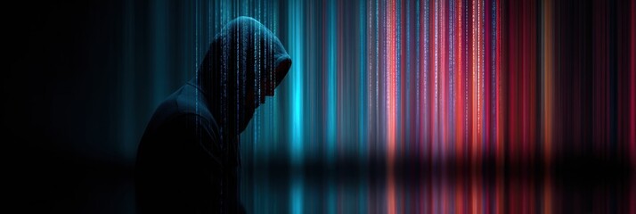 Hacker Silhouette With Data Flowing From Screen Under Abstract Glow at Night