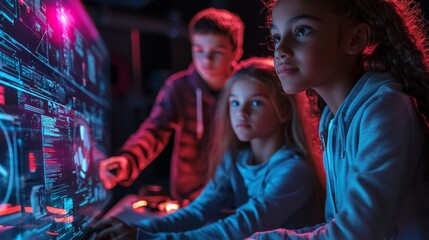 A team of three scientists, two men and one woman, dressed in lab coats, standing in a futuristic research lab with holographic data displays in the background