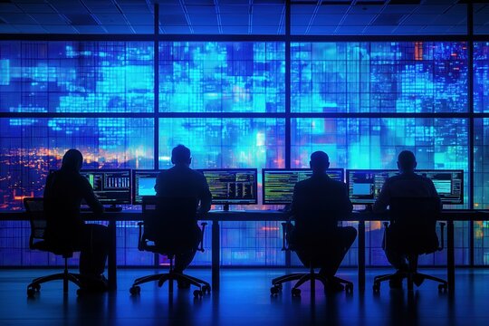 Professionals, multiple computer screens, monitoring complex data, neon blue interface, modern office, cyber security, teamwork concept