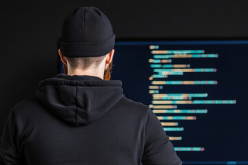 Secret hacker organization workspace, IT specialist analyzing data, large screen displaying complex code, intense atmosphere of innovation and secrecy