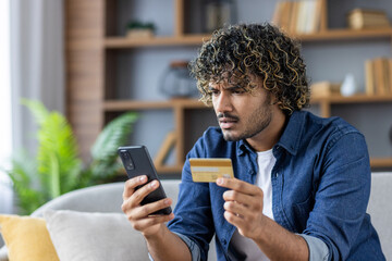 A man looks confused while using a phone and holding a credit card, possibly concerned about online banking fraud or an error. The image portrays themes of finance and technology use.