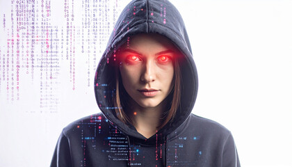 A mysterious figure in a dark hoodie with glowing red eyes, surrounded by digital glitch effects on a background. Ideal for themes of cyber security and digital identity