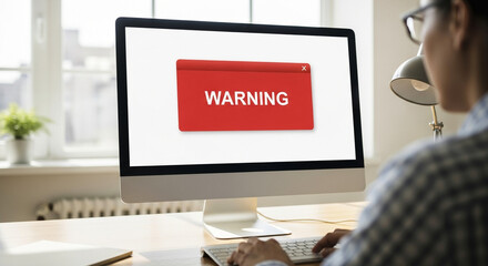 Pop-up warning on computer screen in modern workspace, cybersecurity alert and data protection