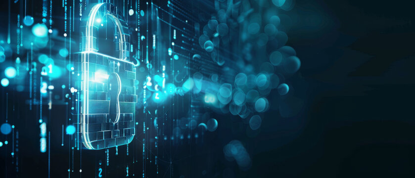 Futuristic cybersecurity concept with holographic lock and digital data streams