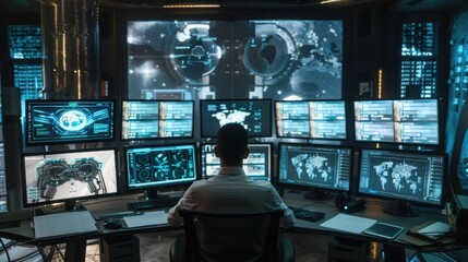 An office worker engages with multiple high-tech screens in a modern remote work setup, managing digital tasks during the day