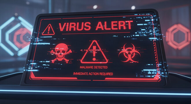 A virus alert warning displayed on a digital screen with red danger symbols and glitch effects, in a futuristic environment
