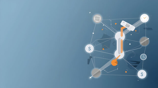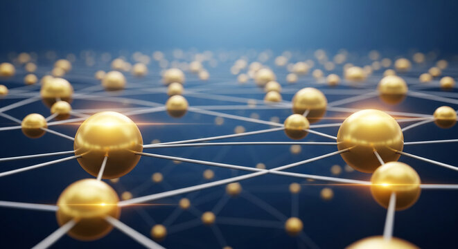 Network of golden spheres connected by thin, bright lines on a dark blue gradient, representing communication, connection, or global network systems