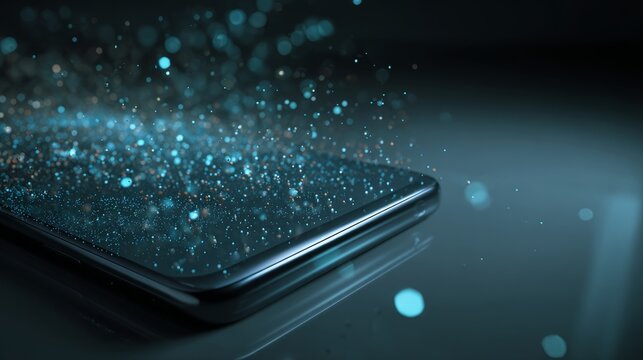 Futuristic smartphone surrounded by glowing digital particles, showcasing advanced mobile technology, innovation, connectivity, and immersive multimedia experience in a modern digital environment